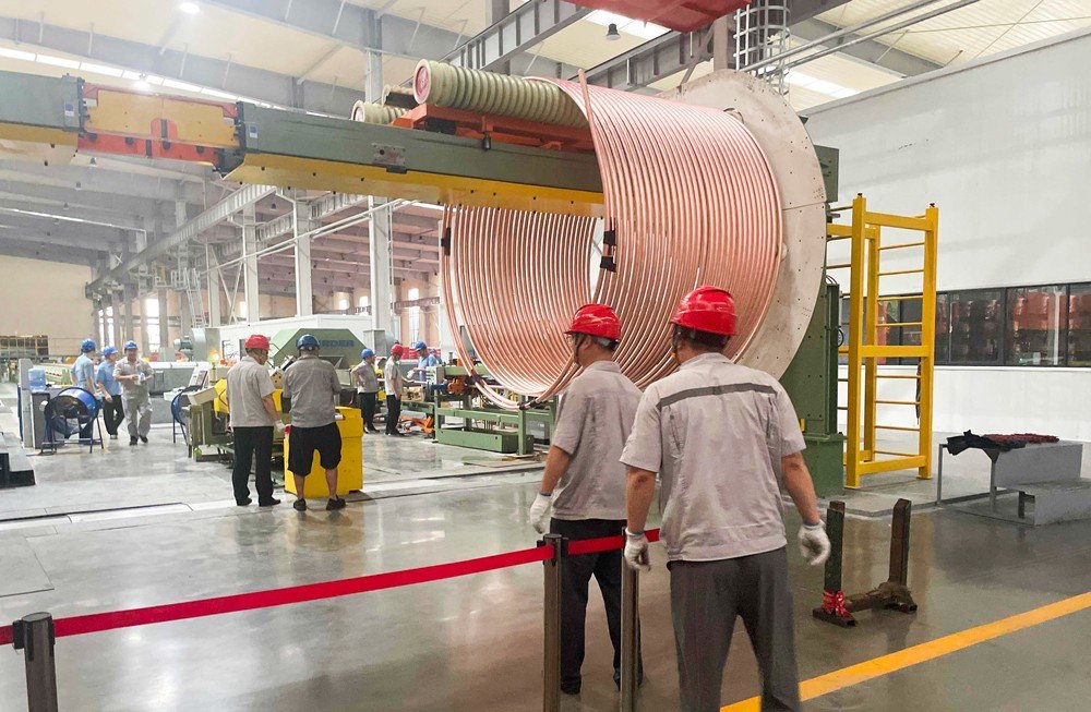 20:55,直管生產(chǎn)班組長于有龍根據(jù)客戶要求開始進(jìn)行Φ54×2直管的工藝試驗(yàn),精度方面必須先確保壁厚2mm不能出現(xiàn)負(fù)公差,再研究控制正公差;幾次試制下來,于班長最終定好拉制工藝,與直拉機(jī)師傅囑咐妥當(dāng)后,才和李祥鵬部長完成交接下班回家。李祥鵬部長、孫濤部長、楊書虎科長、高元陽科長、質(zhì)檢巡檢員羅學(xué)迅輪流駐在直管生產(chǎn)線進(jìn)行檢驗(yàn),把控精度公差,每10分鐘做一次檢測,確保生產(chǎn)出的銅管在客戶要求的范圍之內(nèi)。大直管粗重,拉制起來勞動強(qiáng)度大要求條件高,四位直拉機(jī)員工師傅在高溫下很快汗流浹背,身上的工作服被汗水浸透,被散熱扇吹干了又濕、濕了又干,反反復(fù)復(fù)。李部長看在眼里、疼在心里,忍不住下手與員工師傅并肩一起干。