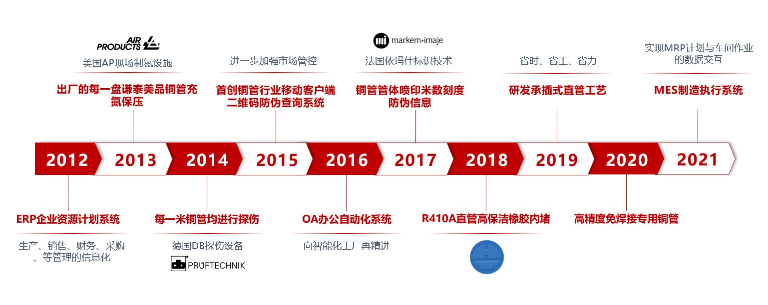 始建于1993年9月的青島宏泰銅業(yè)有限公司,座落于山東省青島市平度同和工業(yè)園同和路97號,從1993年開始一直專注于紫銅管系列產(chǎn)品的研發(fā)和生產(chǎn),是高精度高清潔R410A銅管、給排水銅管、內(nèi)螺紋銅管、蚊香型盤管、醫(yī)療氣體用銅管、地暖管、外徑54毫米以上大口徑銅直管、暖氣片銅管、保溫銅管、覆塑銅水管、毛細(xì)銅管等紫銅管的生產(chǎn)專家與領(lǐng)跑者。宏泰銅管被廣泛應(yīng)用于空調(diào)主機(jī)、中央空調(diào)或多聯(lián)機(jī)空調(diào)、冰箱、冰柜、太陽能、散熱器、導(dǎo)電、健康飲用水、地暖安裝工程、醫(yī)療器械廠和造船廠等。宏泰公司的銅管產(chǎn)銷量在山東省同行業(yè)中遙遙領(lǐng)先,其中宏泰“